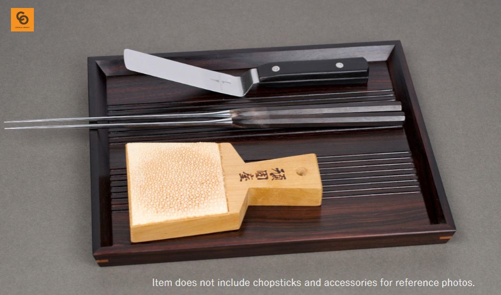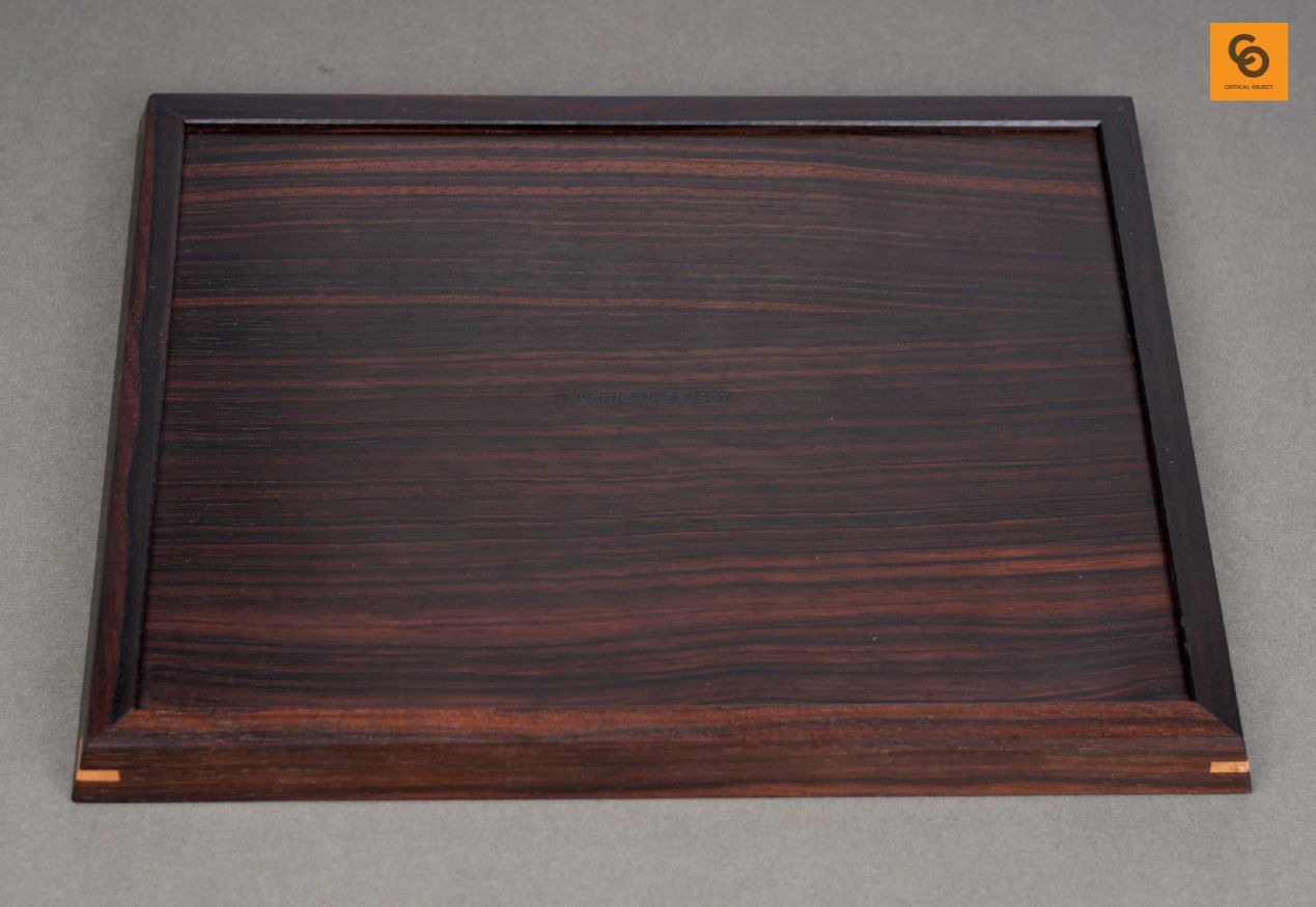 This tray is designed to store smaller working utensils. The tray can be placed below the cutting board, in-between the stands, or it can be used to move around the workspace. It can be used in various work environments. The corners of the tray are detailed and reinforced with Japanese Cherry wood.